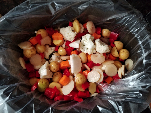 Retrieve the chicken from the refrigerator and nestle the pieces into the top of vegetable mixture. Cover the slow cooker and set on LOW for 4.5 to 5 hours.